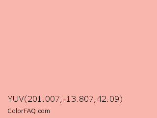 YUV 201.007,-13.807,42.09 Color is a very light red color and the nearest color is Melon Crayola #febaad. Hex code #f9b6ad and RGB value is rgb(249,182,173). In RGB color space, this color is composed of 98% red, 71% green, 68% blue, In CMYK color space, this color is composed of 0% cyan, 27% magenta, 31% yellow , 2% black , In HSL color space, this color has a hue angle of 7° , 86% saturation and 83% lightness.