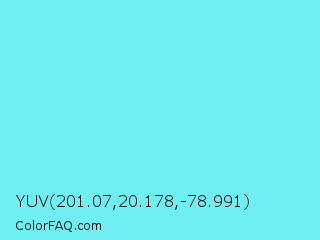 YUV 201.07,20.178,-78.991 Color is a light cyan color and the nearest color is Spray #79deec. Hex code #6feff2 and RGB value is rgb(111,239,242). In RGB color space, this color is composed of 44% red, 94% green, 95% blue, In CMYK color space, this color is composed of 54% cyan, 1% magenta, 0% yellow , 5% black , In HSL color space, this color has a hue angle of 181° , 83% saturation and 69% lightness.