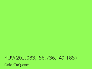 YUV 201.083,-56.736,-49.185 Color is a light green color and the nearest color is Kiwi #8ee53f. Hex code #91fc56 and RGB value is rgb(145,252,86). In RGB color space, this color is composed of 57% red, 99% green, 34% blue, In CMYK color space, this color is composed of 42% cyan, 0% magenta, 66% yellow , 1% black , In HSL color space, this color has a hue angle of 99° , 97% saturation and 66% lightness.