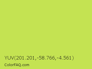 YUV 201.201,-58.766,-4.561 Color is a light lime color and the nearest color is June Bud #bdda57. Hex code #c4e352 and RGB value is rgb(196,227,82). In RGB color space, this color is composed of 77% red, 89% green, 32% blue, In CMYK color space, this color is composed of 14% cyan, 0% magenta, 64% yellow , 11% black , In HSL color space, this color has a hue angle of 73° , 72% saturation and 61% lightness.