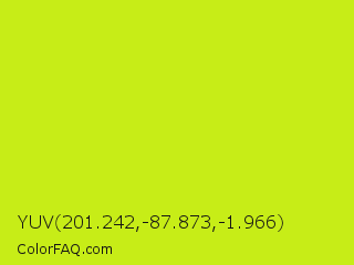 YUV 201.242,-87.873,-1.966 Color is a normal lime color and the nearest color is Las Palmas #c6e610. Hex code #c7ed17 and RGB value is rgb(199,237,23). In RGB color space, this color is composed of 78% red, 93% green, 9% blue, In CMYK color space, this color is composed of 16% cyan, 0% magenta, 90% yellow , 7% black , In HSL color space, this color has a hue angle of 71° , 86% saturation and 51% lightness.