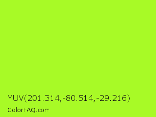 YUV 201.314,-80.514,-29.216 Color is a normal green color and the nearest color is Green Yellow #adff2f. Hex code #a8fa26 and RGB value is rgb(168,250,38). In RGB color space, this color is composed of 66% red, 98% green, 15% blue, In CMYK color space, this color is composed of 33% cyan, 0% magenta, 85% yellow , 2% black , In HSL color space, this color has a hue angle of 83° , 95% saturation and 56% lightness.