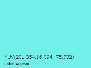 YUV 201.354,16.094,-75.732 Color is a light cyan color and the nearest color is Spray #79deec. Hex code #73efea and RGB value is rgb(115,239,234). In RGB color space, this color is composed of 45% red, 94% green, 92% blue, In CMYK color space, this color is composed of 52% cyan, 0% magenta, 2% yellow , 6% black , In HSL color space, this color has a hue angle of 178° , 79% saturation and 69% lightness.