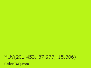 YUV 201.453,-87.977,-15.306 Color is a normal lime color and the nearest color is Inch Worm #b0e313. Hex code #b8f517 and RGB value is rgb(184,245,23). In RGB color space, this color is composed of 72% red, 96% green, 9% blue, In CMYK color space, this color is composed of 25% cyan, 0% magenta, 91% yellow , 4% black , In HSL color space, this color has a hue angle of 76° , 92% saturation and 53% lightness.