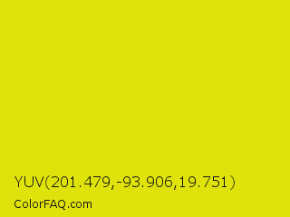 YUV 201.479,-93.906,19.751 Color is a normal yellow color and the nearest color is Piss Yellow #e1e115. Hex code #e0e30b and RGB value is rgb(224,227,11). In RGB color space, this color is composed of 88% red, 89% green, 4% blue, In CMYK color space, this color is composed of 1% cyan, 0% magenta, 95% yellow , 11% black , In HSL color space, this color has a hue angle of 61° , 91% saturation and 47% lightness.