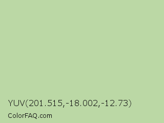 YUV 201.515,-18.002,-12.73 Color is a light green color and the nearest color is Sprout #c1d7b0. Hex code #bbd8a5 and RGB value is rgb(187,216,165). In RGB color space, this color is composed of 73% red, 85% green, 65% blue, In CMYK color space, this color is composed of 13% cyan, 0% magenta, 24% yellow , 15% black , In HSL color space, this color has a hue angle of 94° , 40% saturation and 75% lightness.