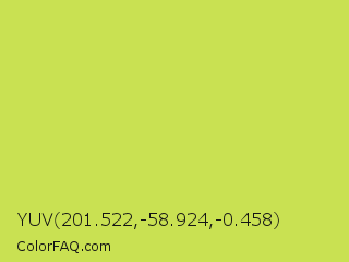 YUV 201.522,-58.924,-0.458 Color is a normal yellow color and the nearest color is June Bud #bdda57. Hex code #c9e152 and RGB value is rgb(201,225,82). In RGB color space, this color is composed of 79% red, 88% green, 32% blue, In CMYK color space, this color is composed of 11% cyan, 0% magenta, 64% yellow , 12% black , In HSL color space, this color has a hue angle of 70° , 70% saturation and 60% lightness.