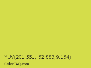 YUV 201.551,-62.883,9.164 Color is a normal yellow color and the nearest color is Wattle #dcd747. Hex code #d4dd4a and RGB value is rgb(212,221,74). In RGB color space, this color is composed of 83% red, 87% green, 29% blue, In CMYK color space, this color is composed of 4% cyan, 0% magenta, 67% yellow , 13% black , In HSL color space, this color has a hue angle of 64° , 68% saturation and 58% lightness.