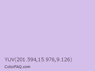 YUV 201.594,15.976,9.126 Color is a very light violet color and the nearest color is Prelude #d0c0e5. Hex code #d4beea and RGB value is rgb(212,190,234). In RGB color space, this color is composed of 83% red, 75% green, 92% blue, In CMYK color space, this color is composed of 9% cyan, 19% magenta, 0% yellow , 8% black , In HSL color space, this color has a hue angle of 270° , 51% saturation and 83% lightness.