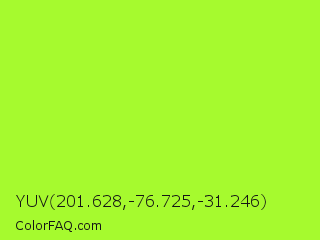 YUV 201.628,-76.725,-31.246 Color is a normal green color and the nearest color is Green Lizard #a7f432. Hex code #a6fa2e and RGB value is rgb(166,250,46). In RGB color space, this color is composed of 65% red, 98% green, 18% blue, In CMYK color space, this color is composed of 34% cyan, 0% magenta, 82% yellow , 2% black , In HSL color space, this color has a hue angle of 85° , 95% saturation and 58% lightness.