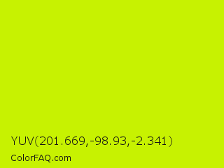 YUV 201.669,-98.93,-2.341 Color is a normal lime color and the nearest color is Electric Lime #ccff00. Hex code #c7f201 and RGB value is rgb(199,242,1). In RGB color space, this color is composed of 78% red, 95% green, 0% blue, In CMYK color space, this color is composed of 18% cyan, 0% magenta, 100% yellow , 5% black , In HSL color space, this color has a hue angle of 71° , 99% saturation and 48% lightness.