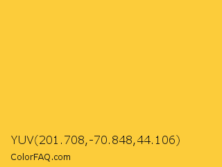 YUV 201.708,-70.848,44.106 Color is a light orange color and the nearest color is Bright Sun #fed33c. Hex code #fccc3a and RGB value is rgb(252,204,58). In RGB color space, this color is composed of 99% red, 80% green, 23% blue, In CMYK color space, this color is composed of 0% cyan, 19% magenta, 77% yellow , 1% black , In HSL color space, this color has a hue angle of 45° , 97% saturation and 61% lightness.