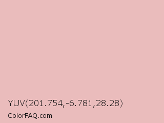 YUV 201.754,-6.781,28.28 Color is a very light red color and the nearest color is Beauty Bush #eec1be. Hex code #eabcbc and RGB value is rgb(234,188,188). In RGB color space, this color is composed of 92% red, 74% green, 74% blue, In CMYK color space, this color is composed of 0% cyan, 20% magenta, 20% yellow , 8% black , In HSL color space, this color has a hue angle of 0° , 52% saturation and 83% lightness.