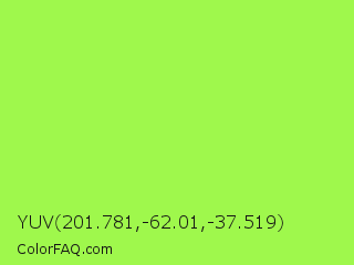 YUV 201.781,-62.01,-37.519 Color is a light green color and the nearest color is French Lime #9efd38. Hex code #9ff84c and RGB value is rgb(159,248,76). In RGB color space, this color is composed of 62% red, 97% green, 30% blue, In CMYK color space, this color is composed of 36% cyan, 0% magenta, 69% yellow , 3% black , In HSL color space, this color has a hue angle of 91° , 92% saturation and 64% lightness.