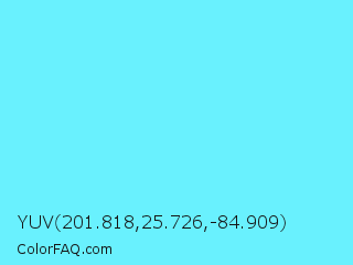 YUV 201.818,25.726,-84.909 Color is a light cyan color and the nearest color is Electric Blue #7df9ff. Hex code #69f1fe and RGB value is rgb(105,241,254). In RGB color space, this color is composed of 41% red, 95% green, 100% blue, In CMYK color space, this color is composed of 59% cyan, 5% magenta, 0% yellow , 0% black , In HSL color space, this color has a hue angle of 185° , 99% saturation and 70% lightness.