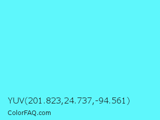 YUV 201.823,24.737,-94.561 Color is a light cyan color and the nearest color is Electric Blue #7df9ff. Hex code #5ef7fc and RGB value is rgb(94,247,252). In RGB color space, this color is composed of 37% red, 97% green, 99% blue, In CMYK color space, this color is composed of 63% cyan, 2% magenta, 0% yellow , 1% black , In HSL color space, this color has a hue angle of 182° , 96% saturation and 68% lightness.