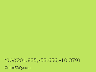 YUV 201.835,-53.656,-10.379 Color is a light lime color and the nearest color is June Bud #bdda57. Hex code #bee55d and RGB value is rgb(190,229,93). In RGB color space, this color is composed of 75% red, 90% green, 36% blue, In CMYK color space, this color is composed of 17% cyan, 0% magenta, 59% yellow , 10% black , In HSL color space, this color has a hue angle of 77° , 72% saturation and 63% lightness.