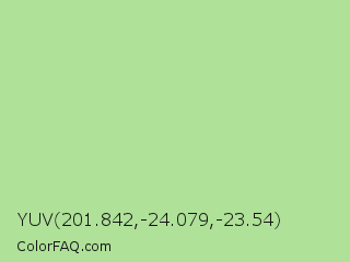 YUV 201.842,-24.079,-23.54 Color is a light green color and the nearest color is Granny Smith Apple #a8e4a0. Hex code #afe199 and RGB value is rgb(175,225,153). In RGB color space, this color is composed of 69% red, 88% green, 60% blue, In CMYK color space, this color is composed of 22% cyan, 0% magenta, 32% yellow , 12% black , In HSL color space, this color has a hue angle of 102° , 55% saturation and 74% lightness.