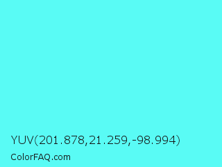 YUV 201.878,21.259,-98.994 Color is a light cyan color and the nearest color is Electric Blue #7df9ff. Hex code #59fbf5 and RGB value is rgb(89,251,245). In RGB color space, this color is composed of 35% red, 98% green, 96% blue, In CMYK color space, this color is composed of 65% cyan, 0% magenta, 2% yellow , 2% black , In HSL color space, this color has a hue angle of 178° , 95% saturation and 67% lightness.