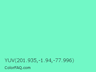 YUV 201.935,-1.94,-77.996 Color is a light green color and the nearest color is Aquamarine #7fffd4. Hex code #71f8c6 and RGB value is rgb(113,248,198). In RGB color space, this color is composed of 44% red, 97% green, 78% blue, In CMYK color space, this color is composed of 54% cyan, 0% magenta, 20% yellow , 3% black , In HSL color space, this color has a hue angle of 158° , 91% saturation and 71% lightness.