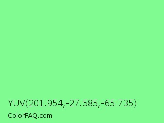YUV 201.954,-27.585,-65.735 Color is a light green color and the nearest color is Light Green #90ee90. Hex code #7ffb92 and RGB value is rgb(127,251,146). In RGB color space, this color is composed of 50% red, 98% green, 57% blue, In CMYK color space, this color is composed of 49% cyan, 0% magenta, 42% yellow , 2% black , In HSL color space, this color has a hue angle of 129° , 94% saturation and 74% lightness.