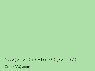 YUV 202.068,-16.796,-26.37 Color is a light green color and the nearest color is Moss Green #addfad. Hex code #ace0a8 and RGB value is rgb(172,224,168). In RGB color space, this color is composed of 67% red, 88% green, 66% blue, In CMYK color space, this color is composed of 23% cyan, 0% magenta, 25% yellow , 12% black , In HSL color space, this color has a hue angle of 116° , 47% saturation and 77% lightness.