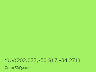 YUV 202.077,-50.817,-34.271 Color is a light green color and the nearest color is Inchworm #b2ec5d. Hex code #a3f263 and RGB value is rgb(163,242,99). In RGB color space, this color is composed of 64% red, 95% green, 39% blue, In CMYK color space, this color is composed of 33% cyan, 0% magenta, 59% yellow , 5% black , In HSL color space, this color has a hue angle of 93° , 85% saturation and 67% lightness.