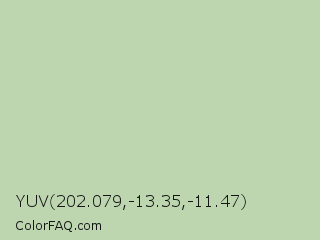 YUV 202.079,-13.35,-11.47 Color is a light green color and the nearest color is Sprout #c1d7b0. Hex code #bdd6af and RGB value is rgb(189,214,175). In RGB color space, this color is composed of 74% red, 84% green, 69% blue, In CMYK color space, this color is composed of 12% cyan, 0% magenta, 18% yellow , 16% black , In HSL color space, this color has a hue angle of 98° , 32% saturation and 76% lightness.