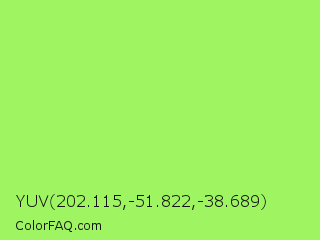 YUV 202.115,-51.822,-38.689 Color is a light green color and the nearest color is Inchworm #b2ec5d. Hex code #9ef561 and RGB value is rgb(158,245,97). In RGB color space, this color is composed of 62% red, 96% green, 38% blue, In CMYK color space, this color is composed of 36% cyan, 0% magenta, 60% yellow , 4% black , In HSL color space, this color has a hue angle of 95° , 88% saturation and 67% lightness.