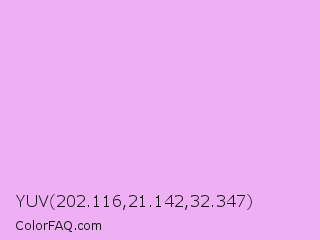 YUV 202.116,21.142,32.347 Color is a very light magenta color and the nearest color is Rich Brilliant Lavender #f1a7fe. Hex code #efaff5 and RGB value is rgb(239,175,245). In RGB color space, this color is composed of 94% red, 69% green, 96% blue, In CMYK color space, this color is composed of 2% cyan, 29% magenta, 0% yellow , 4% black , In HSL color space, this color has a hue angle of 295° , 78% saturation and 82% lightness.