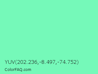 YUV 202.236,-8.497,-74.752 Color is a light green color and the nearest color is Aquamarine #7fffd4. Hex code #75f9b9 and RGB value is rgb(117,249,185). In RGB color space, this color is composed of 46% red, 98% green, 73% blue, In CMYK color space, this color is composed of 53% cyan, 0% magenta, 26% yellow , 2% black , In HSL color space, this color has a hue angle of 151° , 92% saturation and 72% lightness.