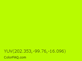 YUV 202.353,-99.76,-16.096 Color is a normal lime color and the nearest color is Lime #bfff00. Hex code #b8fb00 and RGB value is rgb(184,251,-0). In RGB color space, this color is composed of 72% red, 98% green, 0% blue, In CMYK color space, this color is composed of 27% cyan, 0% magenta, 100% yellow , 2% black , In HSL color space, this color has a hue angle of 76° , 100% saturation and 49% lightness.