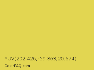 YUV 202.426,-59.863,20.674 Color is a normal yellow color and the nearest color is Confetti #e9d75a. Hex code #e2d651 and RGB value is rgb(226,214,81). In RGB color space, this color is composed of 89% red, 84% green, 32% blue, In CMYK color space, this color is composed of 0% cyan, 5% magenta, 64% yellow , 11% black , In HSL color space, this color has a hue angle of 55° , 71% saturation and 60% lightness.