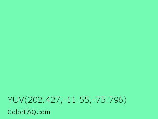 YUV 202.427,-11.55,-75.796 Color is a light green color and the nearest color is Medium Aquamarine #66ddaa. Hex code #74fbb3 and RGB value is rgb(116,251,179). In RGB color space, this color is composed of 45% red, 98% green, 70% blue, In CMYK color space, this color is composed of 54% cyan, 0% magenta, 29% yellow , 2% black , In HSL color space, this color has a hue angle of 148° , 94% saturation and 72% lightness.