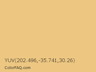 YUV 202.496,-35.741,30.26 Color is a light orange color and the nearest color is Putty #e7cd8c. Hex code #edc782 and RGB value is rgb(237,199,130). In RGB color space, this color is composed of 93% red, 78% green, 51% blue, In CMYK color space, this color is composed of 0% cyan, 16% magenta, 45% yellow , 7% black , In HSL color space, this color has a hue angle of 39° , 75% saturation and 72% lightness.
