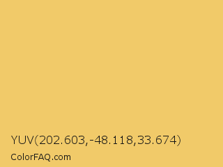 YUV 202.603,-48.118,33.674 Color is a light orange color and the nearest color is Orange Yellow #f8d568. Hex code #f1ca69 and RGB value is rgb(241,202,105). In RGB color space, this color is composed of 95% red, 79% green, 41% blue, In CMYK color space, this color is composed of 0% cyan, 16% magenta, 56% yellow , 5% black , In HSL color space, this color has a hue angle of 43° , 83% saturation and 68% lightness.