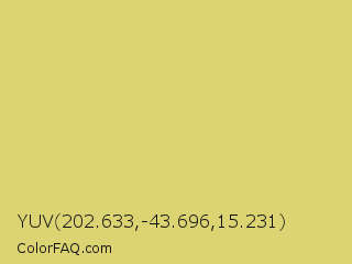 YUV 202.633,-43.696,15.231 Color is a light yellow color and the nearest color is Chenin #dfcd6f. Hex code #dcd372 and RGB value is rgb(220,211,114). In RGB color space, this color is composed of 86% red, 83% green, 45% blue, In CMYK color space, this color is composed of 0% cyan, 4% magenta, 48% yellow , 14% black , In HSL color space, this color has a hue angle of 55° , 60% saturation and 65% lightness.
