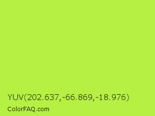 YUV 202.637,-66.869,-18.976 Color is a normal green color and the nearest color is Green Lizard #a7f432. Hex code #b5f043 and RGB value is rgb(181,240,67). In RGB color space, this color is composed of 71% red, 94% green, 26% blue, In CMYK color space, this color is composed of 25% cyan, 0% magenta, 72% yellow , 6% black , In HSL color space, this color has a hue angle of 80° , 85% saturation and 60% lightness.