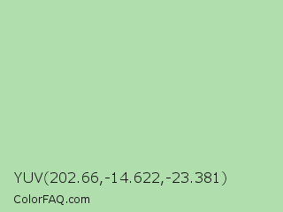 YUV 202.66,-14.622,-23.381 Color is a light green color and the nearest color is Moss Green #addfad. Hex code #b0dead and RGB value is rgb(176,222,173). In RGB color space, this color is composed of 69% red, 87% green, 68% blue, In CMYK color space, this color is composed of 21% cyan, 0% magenta, 22% yellow , 13% black , In HSL color space, this color has a hue angle of 116° , 43% saturation and 77% lightness.