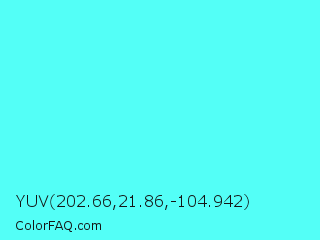 YUV 202.66,21.86,-104.942 Color is a light cyan color and the nearest color is Electric Blue #7df9ff. Hex code #53fff7 and RGB value is rgb(83,255,247). In RGB color space, this color is composed of 33% red, 100% green, 97% blue, In CMYK color space, this color is composed of 67% cyan, 0% magenta, 3% yellow , 0% black , In HSL color space, this color has a hue angle of 177° , 100% saturation and 66% lightness.