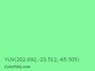 YUV 202.692,-23.512,-65.505 Color is a light green color and the nearest color is Light Green #90ee90. Hex code #80fa9b and RGB value is rgb(128,250,155). In RGB color space, this color is composed of 50% red, 98% green, 61% blue, In CMYK color space, this color is composed of 49% cyan, 0% magenta, 38% yellow , 2% black , In HSL color space, this color has a hue angle of 133° , 92% saturation and 74% lightness.