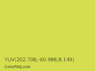 YUV 202.708,-60.988,8.149 Color is a normal yellow color and the nearest color is Maximum Green Yellow #d9e650. Hex code #d4de4f and RGB value is rgb(212,222,79). In RGB color space, this color is composed of 83% red, 87% green, 31% blue, In CMYK color space, this color is composed of 5% cyan, 0% magenta, 64% yellow , 13% black , In HSL color space, this color has a hue angle of 64° , 68% saturation and 59% lightness.