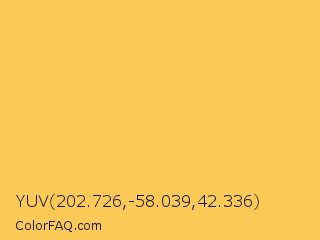 YUV 202.726,-58.039,42.336 Color is a light orange color and the nearest color is Golden Tainoi #ffcc5c. Hex code #fbc955 and RGB value is rgb(251,201,85). In RGB color space, this color is composed of 98% red, 79% green, 33% blue, In CMYK color space, this color is composed of 0% cyan, 20% magenta, 66% yellow , 2% black , In HSL color space, this color has a hue angle of 42° , 95% saturation and 66% lightness.