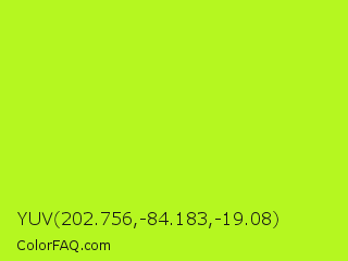 YUV 202.756,-84.183,-19.08 Color is a normal lime color and the nearest color is Green Yellow #adff2f. Hex code #b5f720 and RGB value is rgb(181,247,32). In RGB color space, this color is composed of 71% red, 97% green, 13% blue, In CMYK color space, this color is composed of 27% cyan, 0% magenta, 87% yellow , 3% black , In HSL color space, this color has a hue angle of 78° , 93% saturation and 55% lightness.