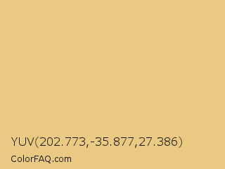 YUV 202.773,-35.877,27.386 Color is a light orange color and the nearest color is Putty #e7cd8c. Hex code #eac982 and RGB value is rgb(234,201,130). In RGB color space, this color is composed of 92% red, 79% green, 51% blue, In CMYK color space, this color is composed of 0% cyan, 14% magenta, 44% yellow , 8% black , In HSL color space, this color has a hue angle of 41° , 71% saturation and 71% lightness.
