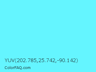 YUV 202.785,25.742,-90.142 Color is a light cyan color and the nearest color is Electric Blue #7df9ff. Hex code #64f5ff and RGB value is rgb(100,245,255). In RGB color space, this color is composed of 39% red, 96% green, 100% blue, In CMYK color space, this color is composed of 61% cyan, 4% magenta, 0% yellow , 0% black , In HSL color space, this color has a hue angle of 184° , 100% saturation and 70% lightness.