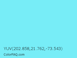 YUV 202.858,21.762,-73.543 Color is a light cyan color and the nearest color is Electric Blue #7df9ff. Hex code #77edf7 and RGB value is rgb(119,237,247). In RGB color space, this color is composed of 47% red, 93% green, 97% blue, In CMYK color space, this color is composed of 52% cyan, 4% magenta, 0% yellow , 3% black , In HSL color space, this color has a hue angle of 185° , 89% saturation and 72% lightness.