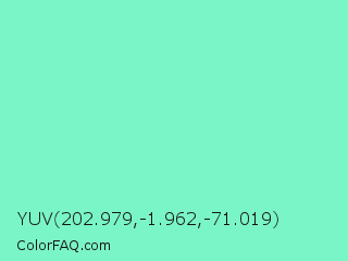 YUV 202.979,-1.962,-71.019 Color is a light green color and the nearest color is Aquamarine #7fffd4. Hex code #7af5c7 and RGB value is rgb(122,245,199). In RGB color space, this color is composed of 48% red, 96% green, 78% blue, In CMYK color space, this color is composed of 50% cyan, 0% magenta, 19% yellow , 4% black , In HSL color space, this color has a hue angle of 158° , 86% saturation and 72% lightness.