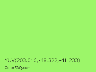 YUV 203.016,-48.322,-41.233 Color is a light green color and the nearest color is Inchworm #b2ec5d. Hex code #9cf669 and RGB value is rgb(156,246,105). In RGB color space, this color is composed of 61% red, 96% green, 41% blue, In CMYK color space, this color is composed of 37% cyan, 0% magenta, 57% yellow , 4% black , In HSL color space, this color has a hue angle of 98° , 89% saturation and 69% lightness.