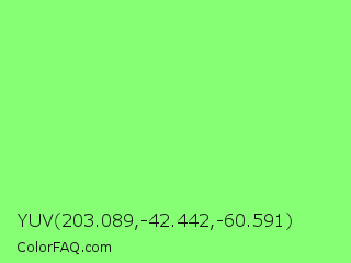 YUV 203.089,-42.442,-60.591 Color is a light green color and the nearest color is Light Green #90ee90. Hex code #86ff75 and RGB value is rgb(134,255,117). In RGB color space, this color is composed of 53% red, 100% green, 46% blue, In CMYK color space, this color is composed of 47% cyan, 0% magenta, 54% yellow , 0% black , In HSL color space, this color has a hue angle of 113° , 100% saturation and 73% lightness.
